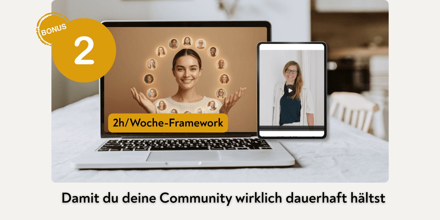 einen klaren Ablauf, feste Strukturen und konkrete Vorlagen, mit denen du deine Community in nur 2 Stunden pro Woche führst – inklusive Grenzen setzen, klarer Kommunikation und einer Routine, die dich trägt statt auslaugt.